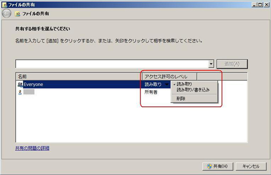 ③[アクセス許可のレベル]で[読み取り]または[読み取り/書き込み]を選択して[共有]をクリックします。