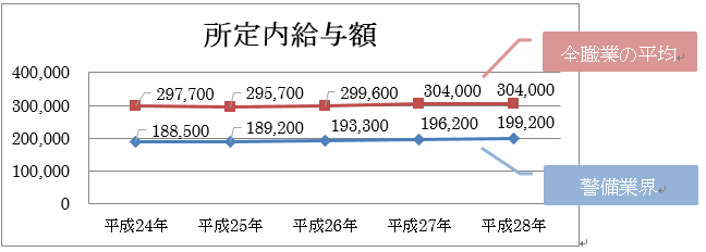 このように、全体の有効求人倍率の5倍以上に達する求人があるのにも関わらず、労働者は一向に集まらない。理由の第一は、その待遇だ。全職種の所定内給与額の平均は30万4,000円に対して、警備員のそれは19万9,200円に過ぎない。つまり、警備員の収入は世の中の平均の2/3以下である。
