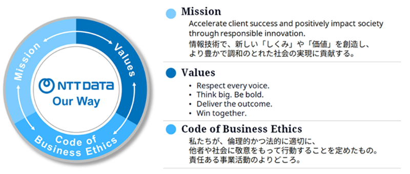 NTTデータグループはTOBにより、2025年9月にNTTの完全子会社となった。これを機に、自分たちの価値をもう一度はっきりさせるため、基本的な考えを「Our Way」としてまとめたという。