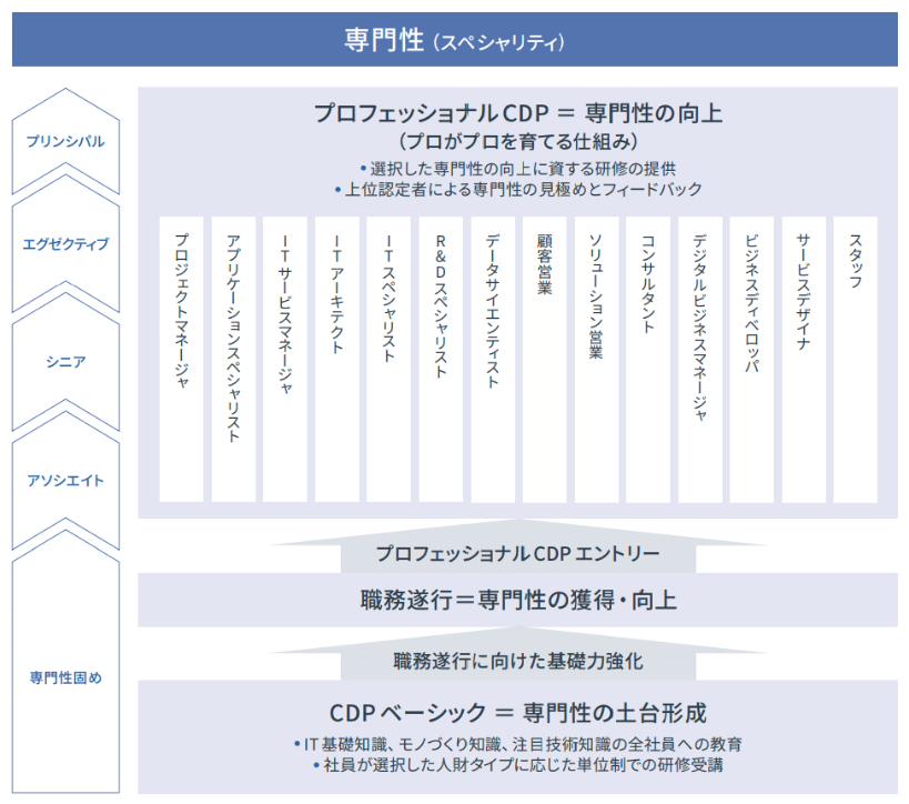 NTTデータグループでは、日本国内の人財育成の仕組みの一つにプロフェッショナルCDPという制度を設け、従業員個人毎の専門性(スペシャリティ)を向上させる仕組みを運用している。